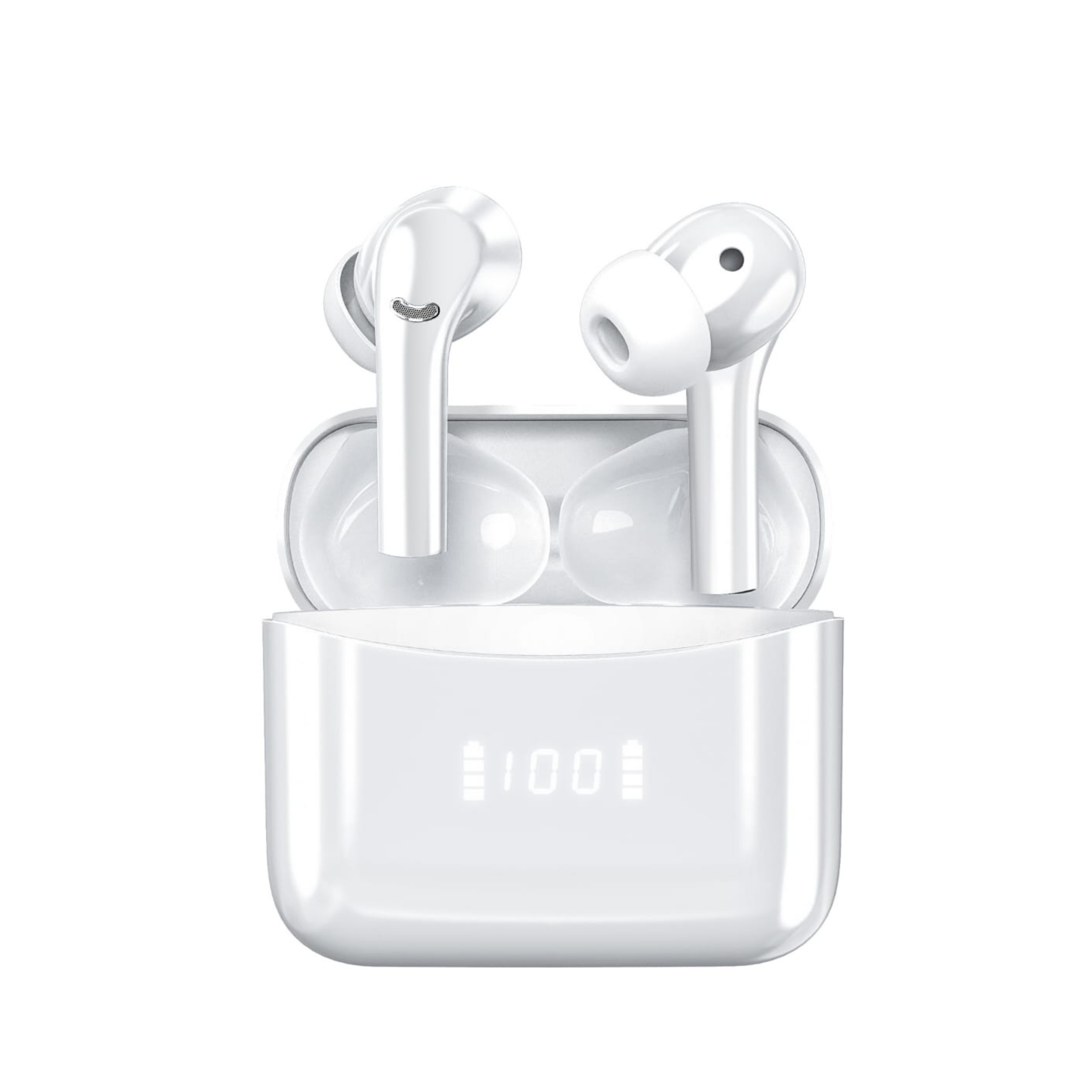 Smart LED digital display on the charging case shows real-time battery levels for both earbuds and the case